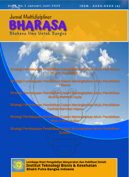 The Jurnal Multidisipliner Bharasa is published 2 (two) times a year, namely in February and August by Lembaga Riset Pengabdian Masyarakat dan Publikasi Ilmiah Institut Teknologi Bisnis dan Kesehatan Bhakti Putra Bangsa Indonesia. The Jurnal Multidisipliner Bharasa is a journal that can be accessed openly for researchers, lecturers, Widyaiswara and students who want to publish their research results in various fields of science.